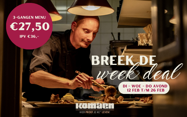 Van 12 februari t/m 26 februari is het bij ons extra genieten: elke dinsdag, woensdag en donderdag kun je aanschuiven voor een heerlijk 3-gangen menu voor €27,50 (normaal €36).